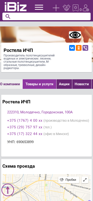 | Название / Заголовок | Ростела ИЧП - Производитель полотенцесушителей водяных и электрических: лесенки, стальные полотенцесушители, М-образные, трехволные, дизайн-радиаторы.. 222310, Молодечно, , Городокская, 100А |