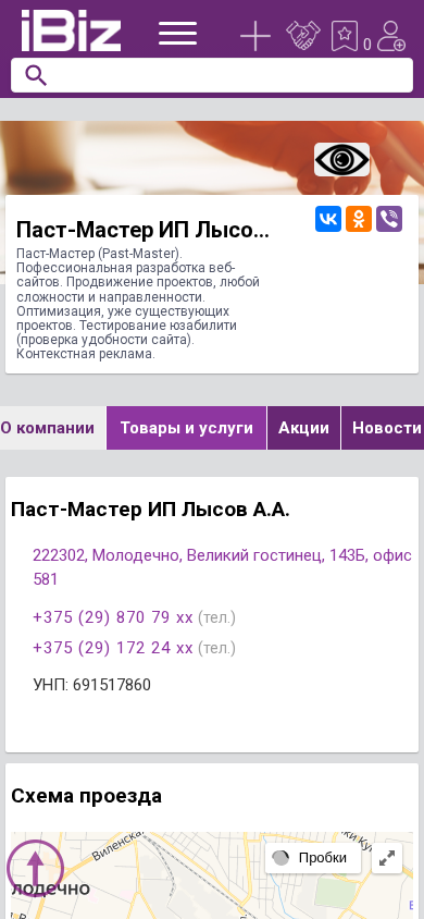 | SEO-описание | Паст-Мастер ИП Лысов А.А. - Паст-Мастер (Past-Master). Пофессиональная разработка веб-сайтов. Продвижение проектов, любой сложности и направленности. Оптимизация, уже существующих проектов. Тестирование юзабилити (проверка удобности сайта). Контекстная реклама. . Схема проезда, контактные телефоны, адрес компании Паст-Мастер ИП Лысов А.А. . 222302, Молодечно, , Великий гостинец, 143Б, офис 581 |