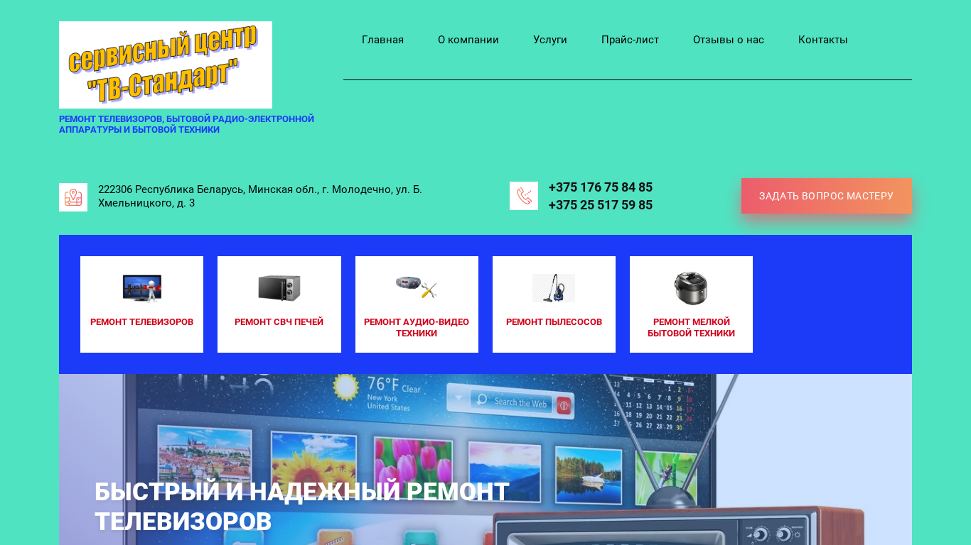 | Название / Заголовок | Сервисный центр ТВ-Стандарт, Ремонт телевизоров в г.Молодечно, Ремонт бытовой техники в г.Молодечно, Ремонт аудио-видеотехники в г.Молодечно |