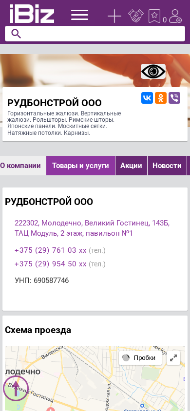 | AI-анализ | This website is a Belarusian business company, РУДБОНСТРОЙ ООО, selling various types of blinds, including horizontal and vertical roller blinds, roller shutters, roman shades, Japanese panels, mosquito nets, and suspended ceilings with carpentry. The company is located in Mолодечно, Великий Гостинец, 143Б, TAC Modul, 2nd floor, pavilion #1. The contact information includes two phone numbers and the company's Unified State Registration Number (УНП). The website also provides a map and opening hours. |
