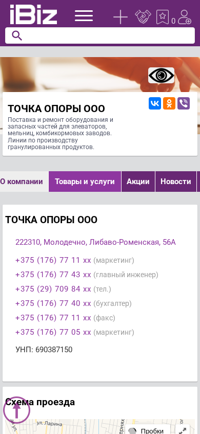 | Название / Заголовок | ТОЧКА ОПОРЫ ООО - Поставка и ремонт оборудования и запасных частей для элеваторов, мельниц, комбикормовых заводов. Линии по производству гранулированных продуктов.. 222310, Молодечно, , Либаво-Роменская, 56А |