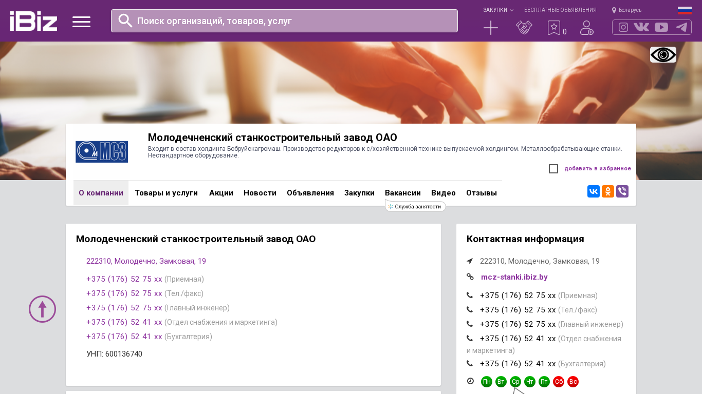 | Название / Заголовок | Молодечненский станкостроительный завод ОАО - Входит в состав холдинга Бобруйскагромаш. Производство редукторов к с/хозяйственной технике выпускаемой холдингом. Металлообрабатывающие станки. Нестандартное оборудование.. 222310, Молодечно, , Замковая, 19 |