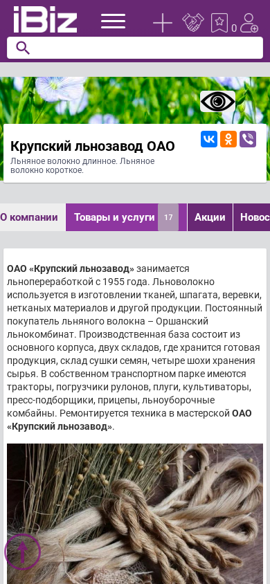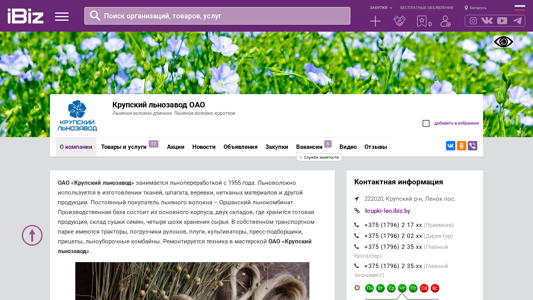 | AI-анализ | The web project "Krupsky Linen Mill OAO" is a Belarusian company specializing in flax processing since 1955. The company produces long and short flax fibers, used for textiles, twine, non-woven materials, and other products. A steady buyer of flax fibers is Orshansky Linen Combine. The production complex includes a main building, two warehouses for storing finished products, a seed drying shed, and four storage silos for raw material. The transport fleet includes tractors, loaders, plows, cultivators, compressor-loader wagons, trailers, and flax harvesting combines. The machinery is repaired in the OAO "Krupsky Linen Mill" workshop. The company manufactures long and short flax fibers, twine, and shives. As a by |