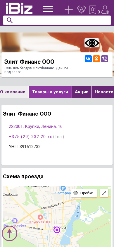 SEO-описаниеЭлит Финанс ООО - Сеть ломбардов ЭлитФинанс. Деньги под залог.. Схема проезда, контактные телефоны, адрес компании Элит Финанс ООО. 222001, Крупки, , Ленина, 16