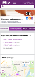 | AI-анализ | The website is for Krupka District Polyclinic UZ, which offers medical services and anti-epidemic measures. The address is given as 222001, Krupki, Chernyahovskogo, 2. Contact details include two telephone numbers, +375 (1796) 5 52 xx and +375 (1796) 5 44 xx. The company's UNP number is 600094850. The website also includes a map for directions, business hours (Monday to Saturday, 7:00 AM to 8:00 PM except for Sunday, which is a day off), and a section for announcements, vacancies, and reviews. The website is listed under the categories of 'Policlinics' and 'Policlinics in K |