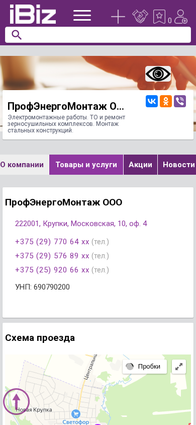 | Название / Заголовок | ПрофЭнергоМонтаж ООО - Электромонтажные работы. ТО и ремонт зерносушильных комплексов. Монтаж стальных конструкций.. 222001, Крупки, , Московская, 10, оф. 4 |