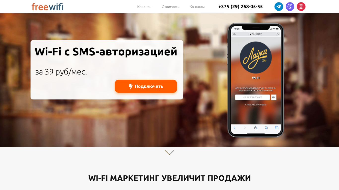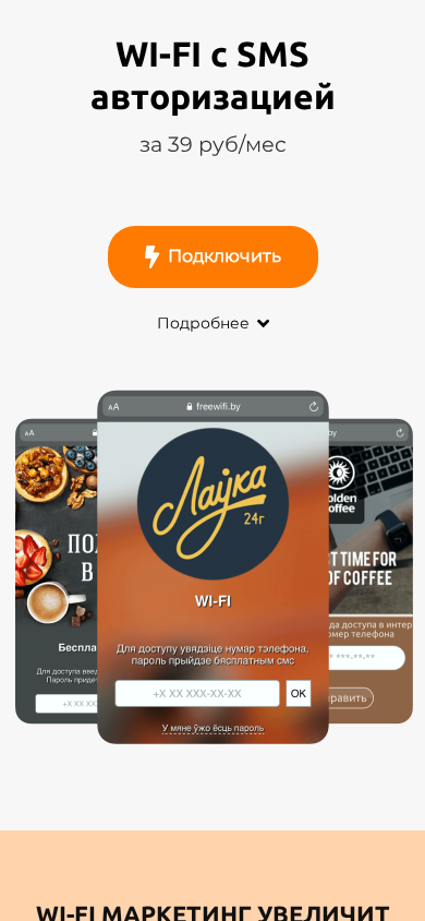 | SEO-описание | WIFI для бизнеса с смс-авторизацией. Доступ к интернету для посетителей ваших заведений или точек продаж. Получайте контакты гостей для маркетинга не нарушая законы. |