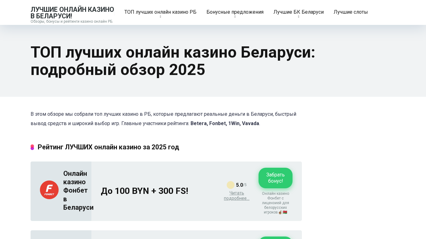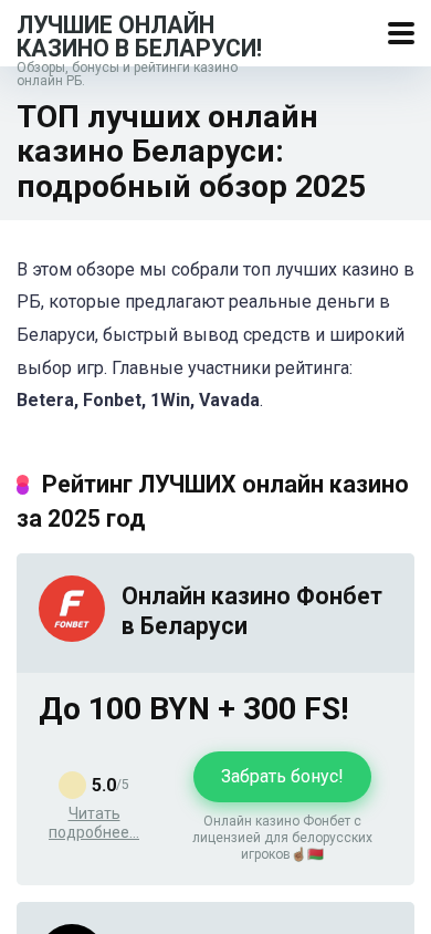 | SEO-описание | Лучшие онлайн казино Беларуси 2025: обзор Betera, Fonbet, 1Win и Vavada. Бонусы за регистрацию, слоты на реальные деньги, быстрый вывод средств. |