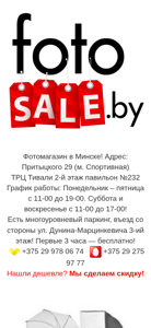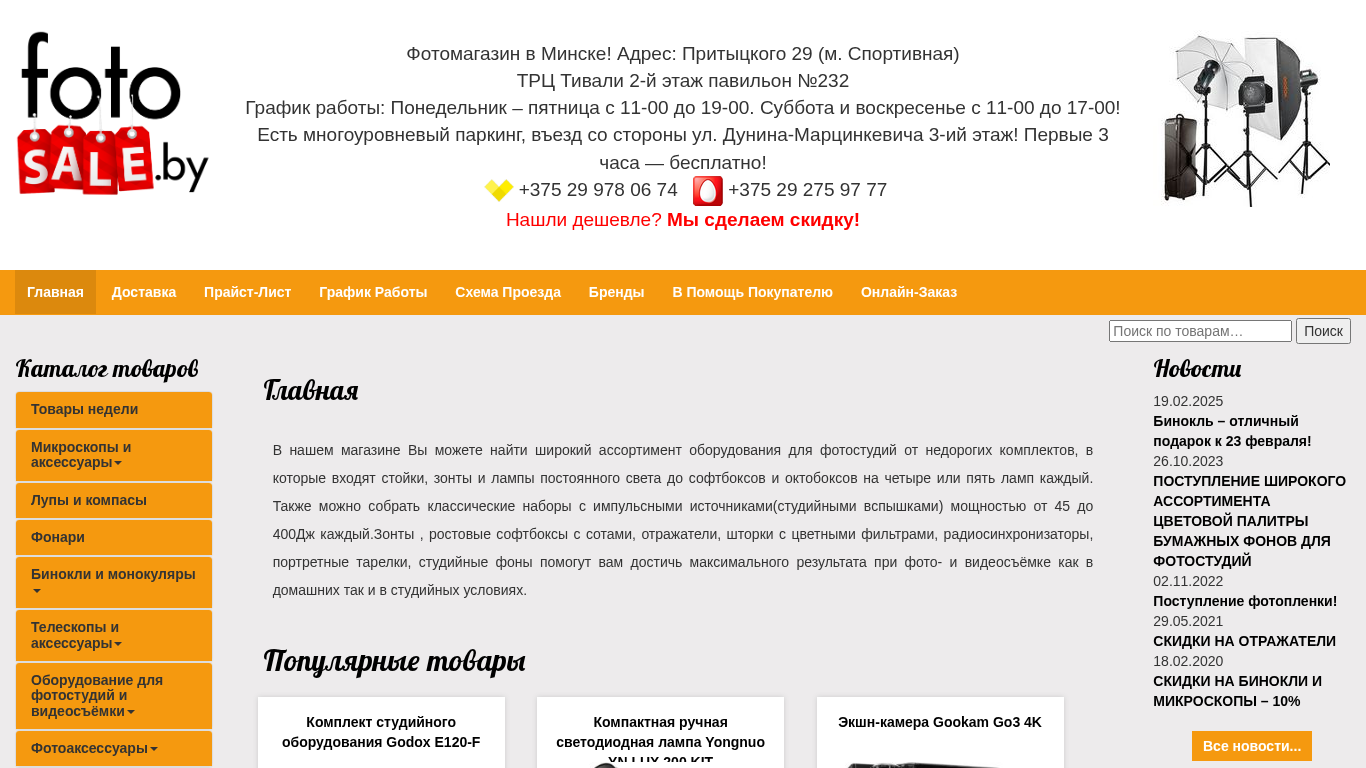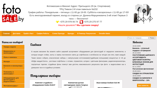The portal Fotosale.by is an e-commerce website located in Minsk, Belarus, specializing in the sale of photography equipment, studio equipment, and photo accessories. The store is situated at Pritytskogo 29, in the Sportivnaya shopping center on the second floor, pavilion number 232. The business operates Monday through Friday from 11 AM to 7 PM, and on Saturdays and Sundays from 11 AM to 5 PM. The website offers both in-store and online purchasing options. The catalog includes various photography and studio equipment brands, such as Godox, Yongnuo, Fotokvant, and others. The website also features a price list, delivery information, and a helpful customer service section for online orders and product inquiries.