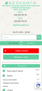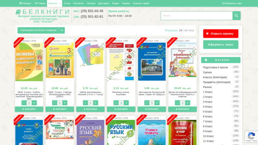 | AI-анализ | This online resource is Belkniigi.by, an e-commerce website specializing in the sale of educational literature. The site offers a wide range of products including textbooks, workbooks, training manuals, tables, and various printed materials for different classes from 1 to 11, as well as preparation for school and kindergarten education. The catalog includes categories for subjects such as mathematics, Russian and Belarusian languages, literature, and various other subjects. The website is operated by OOO “КнигАрт” and can be contacted via mobile phone at (29) 831-60-36 or by landline at (25) 501-82-81. The business hours are from 9:00 to 18:00. The website also features a VIP account, shopping cart, and options for payment, delivery |
