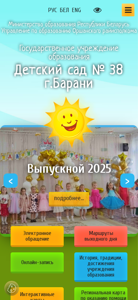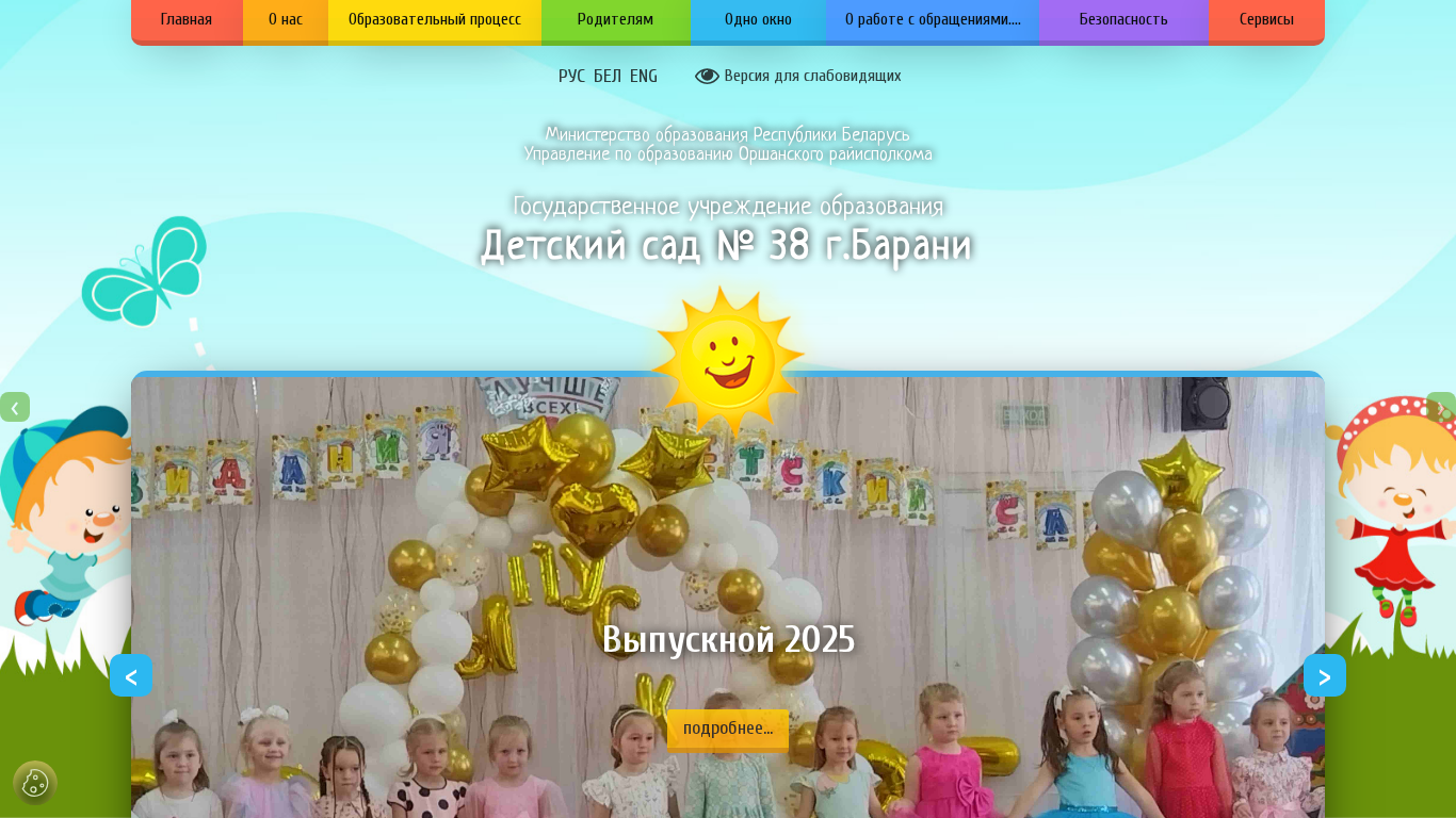 | AI-анализ | The web project ds38.goroo-orsha.by is a website for Baranivskiy Kindergarten No. 38 in Gorodok, Belarus. The site primarily informs visitors about the kindergarten, its structure, and its policies. Keywords associated with the site include 'educational institutions', 'children', 'administration', 'regime', and 'safety'. The site offers pages for the administration, collective, history, goals and conditions of admission, as well as information on policies towards corruption, social and psychological services, and news. Additionally, there are sections dedicated to educational processes, additional educational services, a sensory room, inclusive education, spiritual and moral education, a teacher-psychologist, a music director, a methodological cabinet, a teacher-defectologist, teachers, sports, ideological work for parents, and various routes for the day. The |
