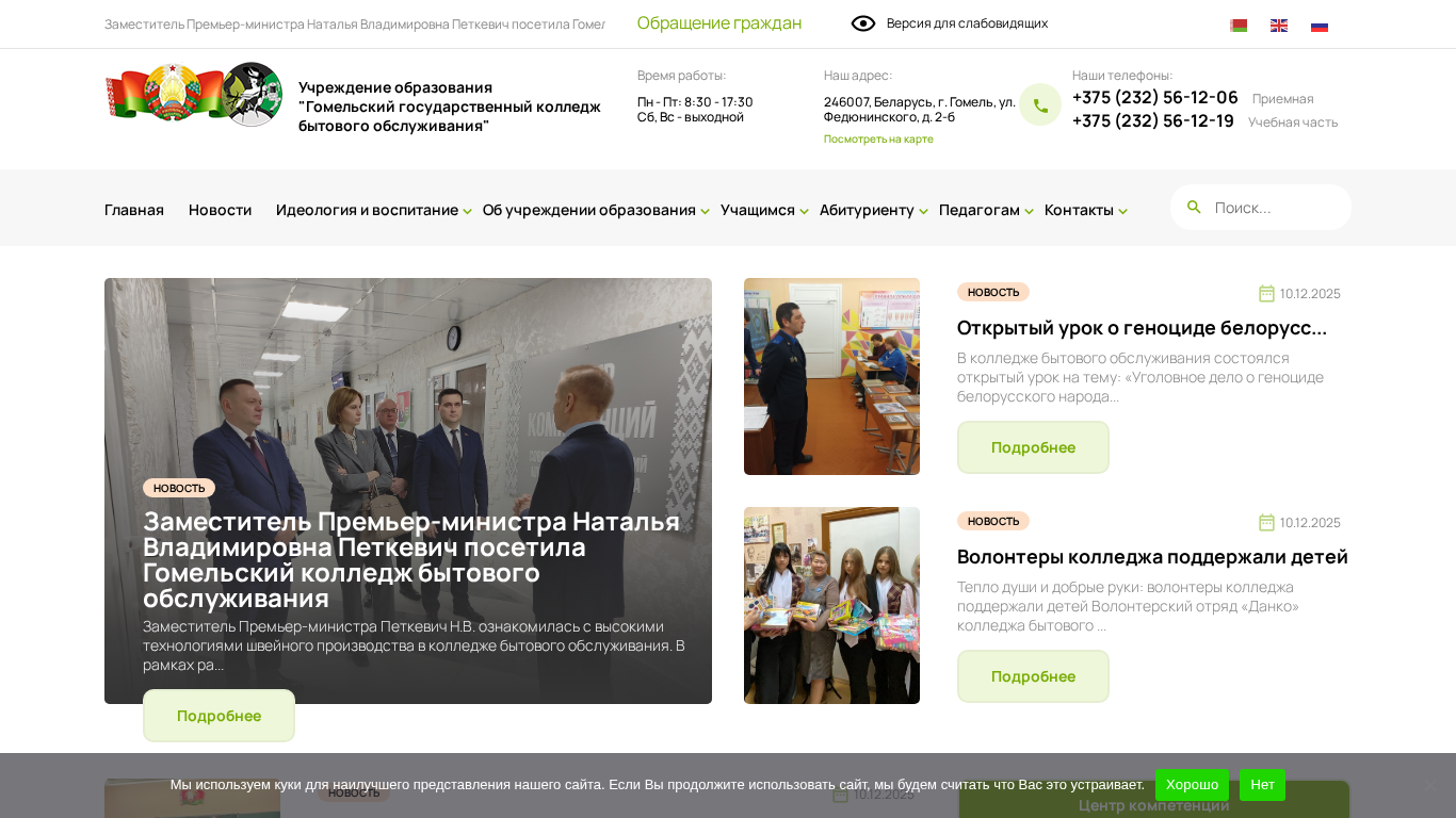 | SEO-описание | Официальный сайт УО «Гомельский государственный колледж бытового обслуживания». Актуальная информация для учащихся и поступающих, новости. |