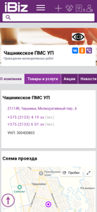 | AI-анализ | The website is for 'Чашникское ПМС УП' (Chashnikskoe PMS UP), a company based in the Belarusian town of Chapshniki, providing meliorative works. The title and description of the website mention the company name, its location at Мелиоративный пер., 6, and the contact telephone numbers +375 (2133) 4 19 xx and +375 (2133) 6 01 xx. The website also includes a map for directions, the Unified State Register of Enterprises number 300430803, and business hours from Monday to Saturday, 9:00 AM to 6:00 PM, without a lunch break. The website falls under the categories of 'Мелиоративные работы, меха |