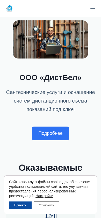 | SEO-описание | ООО "ДистБел" Сантехнические услуги и оснащение систем дистанционного съема показаний под ключ Подробнее Оказываемые услуги Монтаж счетчиков воды Услуги по |