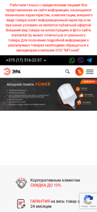 | AI-анализ | --- The web project "Электротехническая продукция ЭРА по оптовым ценам" is a Belarusian e-commerce website selling LED lighting and electrical products for both residential and industrial use. The website is operated by OOO МП-снаб, an official supplier of ERA brand products in Belarus. The site provides information on various technical specifications, product configurations, and visuals, but this information is for informational purposes only and does not constitute a public offer. The actual appearance of the products may differ from the illustrations and photos on the site. Interested buyers should contact the company for detailed product information. The website features a catalog section for lighting and electrical products, as well as sections for home, office, and industrial products. The company also offers certificates, information on the company, and an opportunity to become a dealer in Belarus. |