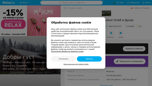 | SEO-описание | База отдыха Хлеб&Soul (Хлеб и Душа) в Минске – цены за проживание, отзывы,возможность забронировать коттедж/усадьбу онлайн на Relax.by |