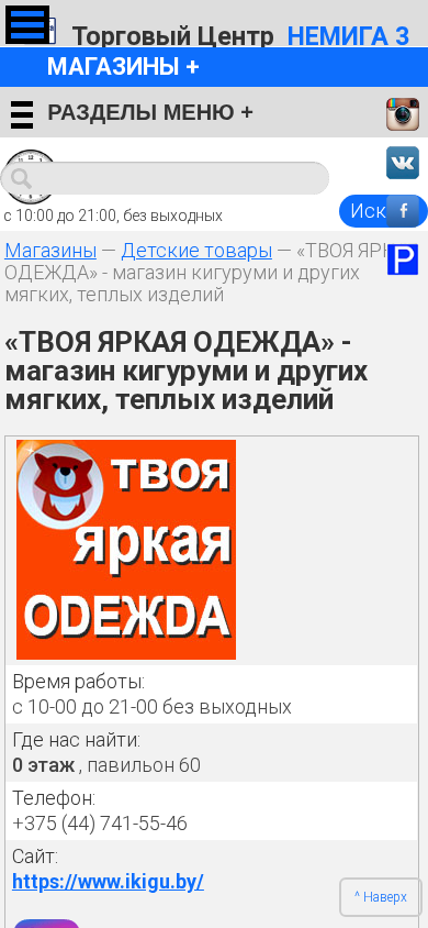 | AI-анализ | The web project "Your Bright Clothing - «ТВОЯ ЯРКАЯ ОДЕЖДА»" is a store located in the Nemiga 3 Shopping Center in Minsk, Belarus. This shopping center offers various shops, offices for rent, services, cafes, and parking facilities. The store specializes in selling bright and colorful kigurumi-pajamas, pledovs, cushions, slippers, toys, and other items. It offers a wide range of clothing for women and men, including footwear, accessories, and items made of leather and meh. Additionally, the store sells sports equipment, bags, hats, jewelry, gifts, beauty products, perfumes, lingerie, swimwear, glasses, art supplies, children's toys, and books. The shopping center, which also includes technology and home goods stores, a photo studio |