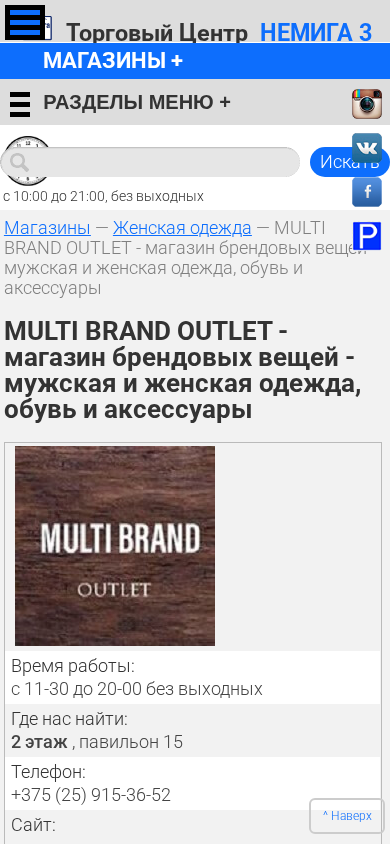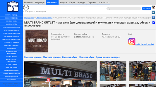| Название / Заголовок | MULTI BRAND - OUTLET брендовых вещей - мужская и женская одежда, обувь и аксессуары ::Торговый Центр «Немига 3» |