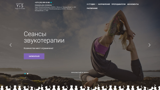 The portal Yoga-Tut Studio is a yoga school located in Minsk, Belarus, offering classes for beginners and professionals. The studio operates daily from 9 a.m. to 11 p.m. with a wide range of yoga styles. The schedule, prices, and experienced team of teachers are provided on the website. The studio is situated in the center of Minsk at Kalyvaryska Street, building 1, apartment 404. The address for correspondence is the same. The studio offers group or individual classes and sessions of sound therapy with limited seating availability. Visitors are welcome to choose from various yoga styles including hatha-yoga, somatic yoga, yoga in hammocks for children and adults, sound therapy, stretching, Pilates, and healthy spine classes. The teachers regularly enhance their skills by attending seminars and courses and have achievements and