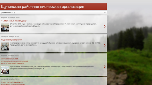 | AI-анализ | The portal Schuchinbrpo.blogspot.com.by is a blog dedicated to the activities of the Щучинская районная пионерская организация (Щучинskaya raionnaya pionerskaya organizatsiya), a youth organization in Belarus. The website features news about various events and educational programs organized by the organization, such as "Я. Моя семья. Моя Родина" (I. My family. My homeland), "Лидерский университет" (Leadership university), and "Слышали! Знаем!" (Have you heard? Know it!). The blog also includes a leader's diary, a library for scout leaders, and information about musical-entertainment games and republican marathons. The website is built on the Blogger platform and was last updated on October 17, 2 |