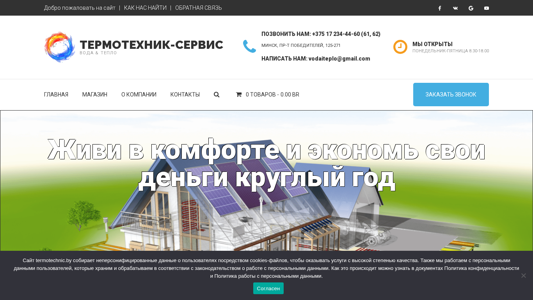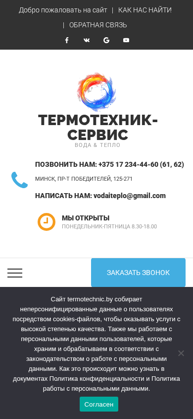 | Адрес | Обратная связь, Термотехник-сервис, Вода & Тепло, Позвонить нам:, +375 17 234-44-60 (61, 62), Минск, пр-т Победителей, 125-271 |