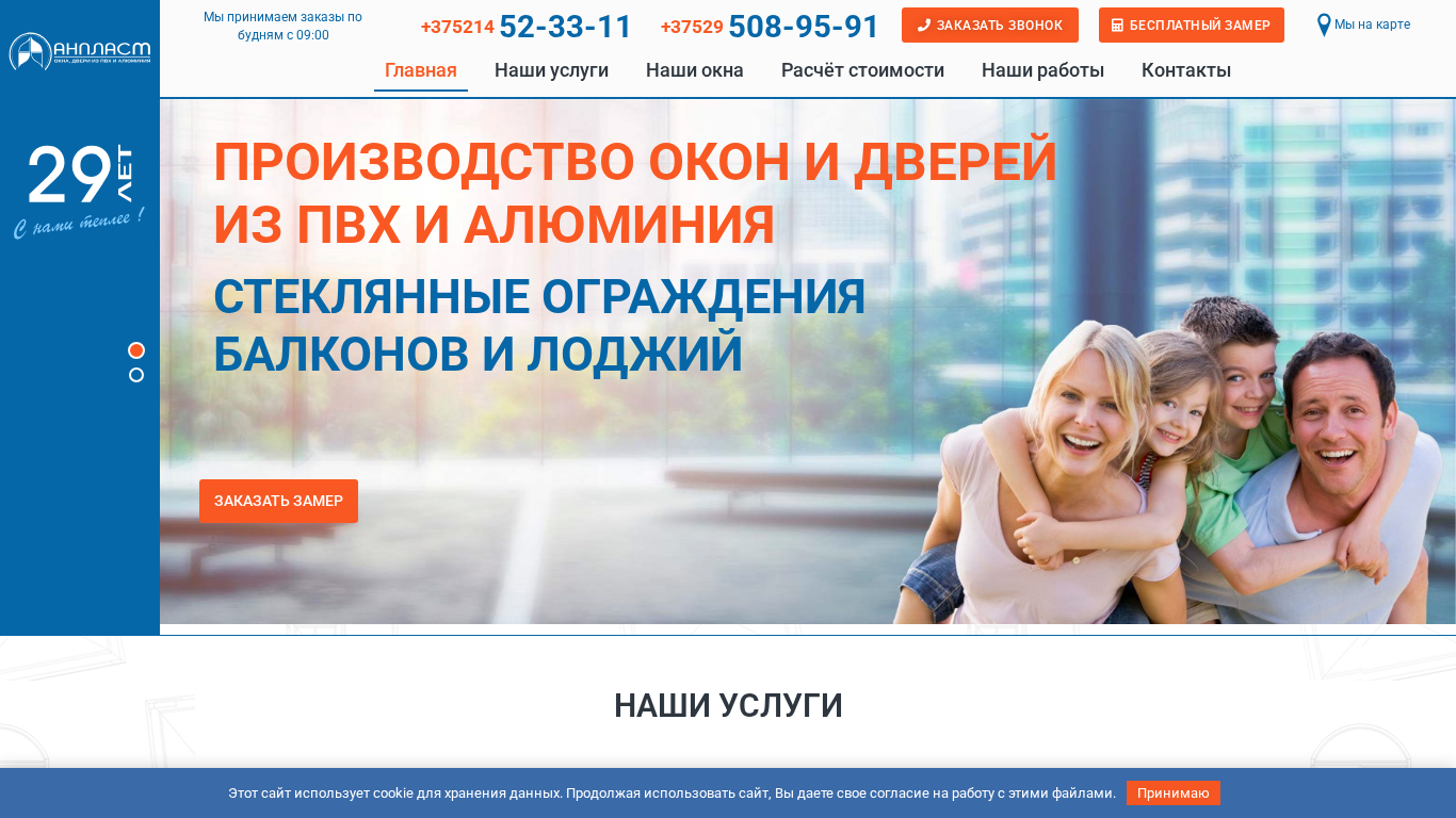 | SEO-описание | Производство окон и дверей из ПВХ и алюминия в Новополоцке, Полоцке и Витебской области. Доступная цена, гарантия, рассрочка платежа. |