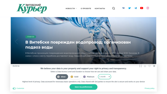 | AI-анализ | <aside> The website 'Vkurier.by' is a news platform dedicated to reporting events, activities, and announcements in the economic, social, and cultural life of Vitsebsk and the surrounding region. It includes photo reports and information on local happenings. Keywords related to the site include 'Vitsebsk', 'region', 'news', 'events', 'announcements', 'economy', 'finances', 'politics', 'auto', 'society', 'business', and 'accidents'. In the provided text, there are reports of a water main break in Vitsebsk city, which resulted in the distribution of water to affected areas, and a high number of traffic accidents over the weekend in the Vitsebsk region. Additionally, there is a mention of a company in Novopolotsk being held accountable for unpaid wages, and an incident at a |