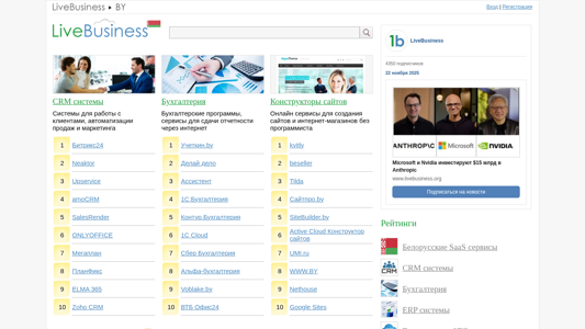| AI-анализ | The portal "ИТ новости Беларуси" (IT News Belarus) offers news, SaaS CRM and ERP systems, accounting software, website constructors, and cloud storage solutions for Belarusian businesses. The title and description include keywords related to Belarus, IT news, SaaS services, systems, CRM, ERP, accounting, websites, and cloud storage. The top words indicate a focus on Беларуси (Belarus), 2025, data, services, systems, бухгалтерия (buhgalteria, accounting), решение (solution), CRM, сайтов (saity, sites), cloud, компании (companies), and позволяет (allows). The website features CRM systems for working with clients, sales, and marketing, including Bitrix24, Neaktor |