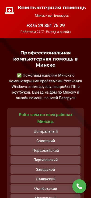 | SEO-описание | Компьютерный мастер в Минске. Установка Windows, антивирусов, настройка ПК и ноутбуков. Выезд на дом и онлайн помощь по Беларуси. Работаем 24/7. |