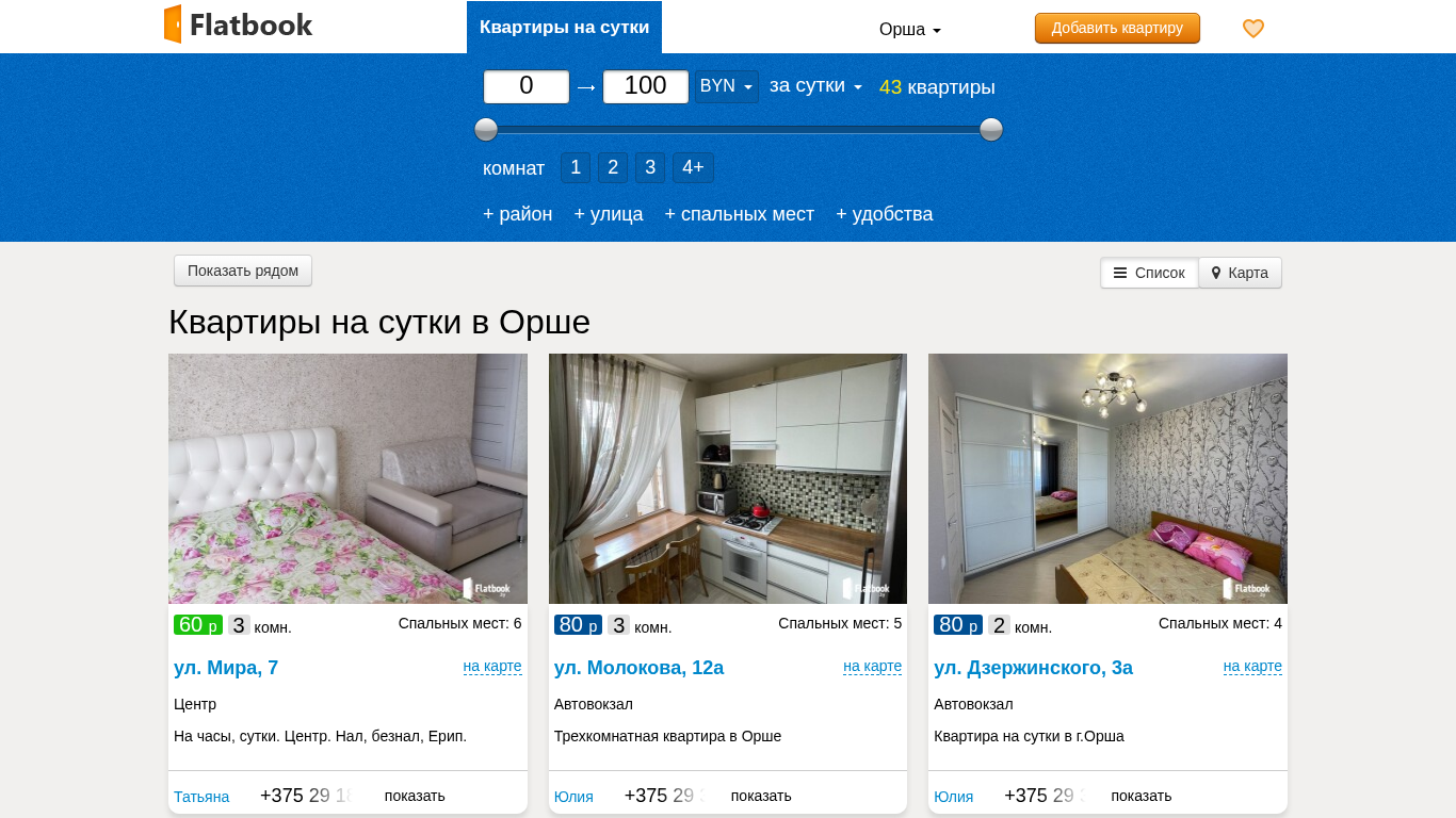 | SEO-описание | Квартиры на сутки в Орше: 43 квартир 30-80 р. 1,2,3,4-х комнатные. Сутки/ночь/часы. Любой район. Цены от Хозяев. Выбирайте! |