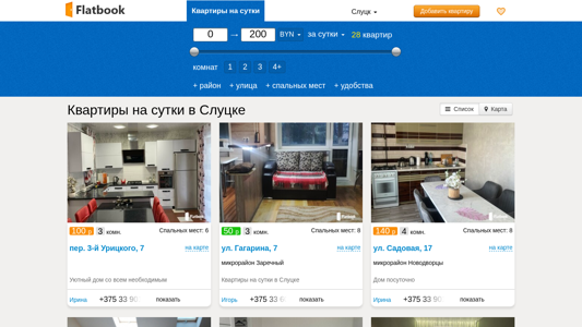 | SEO-описание | Квартиры на сутки в Слуцке: 28 квартир 50-140 р. 1,2,3,4-х комнатные. Сутки/ночь/часы. Любой район. Цены от Хозяев. Выбирайте! |
