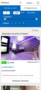 This website is an online marketplace for renting apartments in the city of Gomel, Belarus, on a daily, hourly, or monthly basis, without the need for intermediaries. It offers 70 listings of one-room to four-room apartments, with prices ranging from 40 to 200 Belarusian Rubles per day, per night, per hour, per week, or per month. The apartments are available in various districts, with prices set by the property owners. Users can browse the listings by district, number of bedrooms, and additional amenities. The website also includes an option to filter the search results and a map view of the apartment locations. Some listings include contact information for direct communication with the property owners.