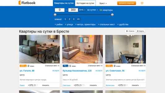 --- This online resource provides information on renting apartments in Brest, Belarus, on a daily, hourly, or weekly basis, without the involvement of intermediaries. The platform lists 94 apartments, with prices ranging from 45 to 250 Belarusian Rubles for one-room to four-room units. Users can browse listings by location and availability of bedrooms, with details such as street addresses and contacts provided for each property. The website offers options to filter by price, number of bedrooms, and district, with additional details on the number of sleeping places and amenities available.