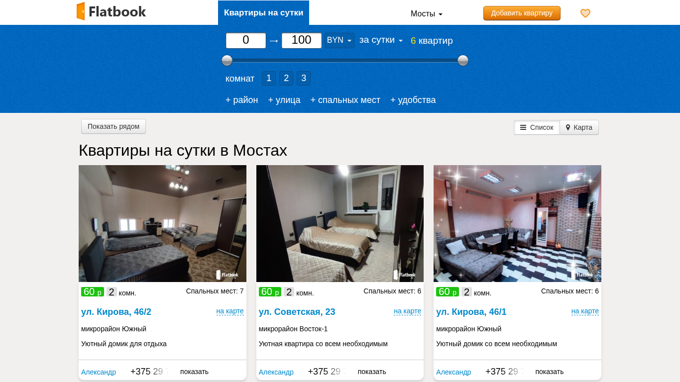 | SEO-описание | Квартиры на сутки в Мостах: 6 квартир 50-90 р. 1,2,3,4-х комнатные. Сутки/ночь/часы. Любой район. Цены от Хозяев. Выбирайте! |