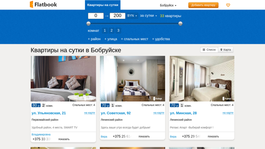 | AI-анализ | The portal offers daily rentals of apartments in Bobruisk without intermediaries. Users can choose from 33 apartments ranging from 40 to 120 rubles per day for one-room to four-room units. The list includes information on the apartment's location, number of sleeping places, and amenities. Some examples include a studio apartment on Ul. Ulyanovskaya, 21 in the First of May district for 80 rubles per day, and an apartment on Ul. Sovetskaya, 92 in the Leninsky district for 70 rubles per day. Users can contact the apartment owners directly via phone or message to arrange a viewing or make a reservation. The website also includes a map and a search function to help users locate and compare apartments easily. |