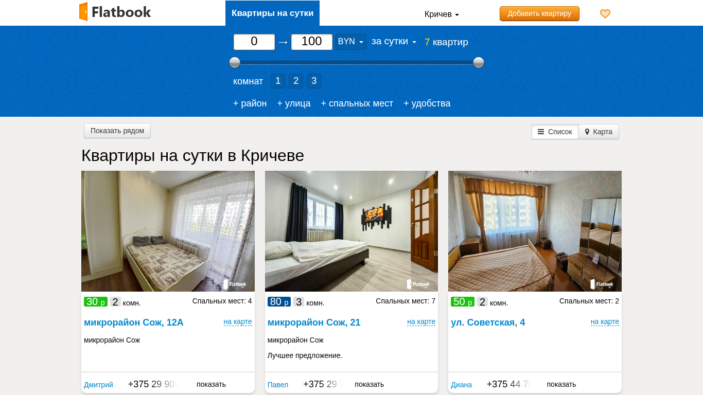 The portal offers apartments for rent by the day in Krichev. Choose from 7 apartments, ranging from one-room to four-room options, with prices starting from 30 Belarusian rubles per hour, per day, or per night. Apartments are available in various neighborhoods, with prices set by the landlords. Users can add apartments, filter results, and view maps and contact information for each listing. Listings include details such as the neighborhood, number of bedrooms, number of sleeping spaces, and amenities. The portal is part of the FlatBook network and has a .BY domain.