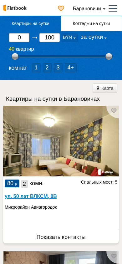 | SEO-описание | Квартиры на сутки в Барановичах: 40 квартир 40-80 р. 1,2,3,4-х комнатные. Сутки/ночь/часы. Любой район. Цены от Хозяев. Выбирайте! |