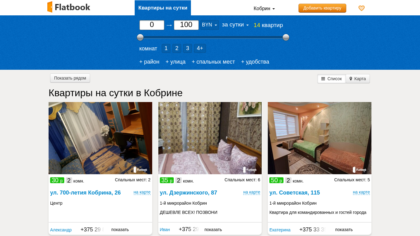 | SEO-описание | Квартиры на сутки в Кобрине: 14 квартир 30-80 р. 1,2,3,4-х комнатные. Сутки/ночь/часы. Любой район. Цены от Хозяев. Выбирайте! |
