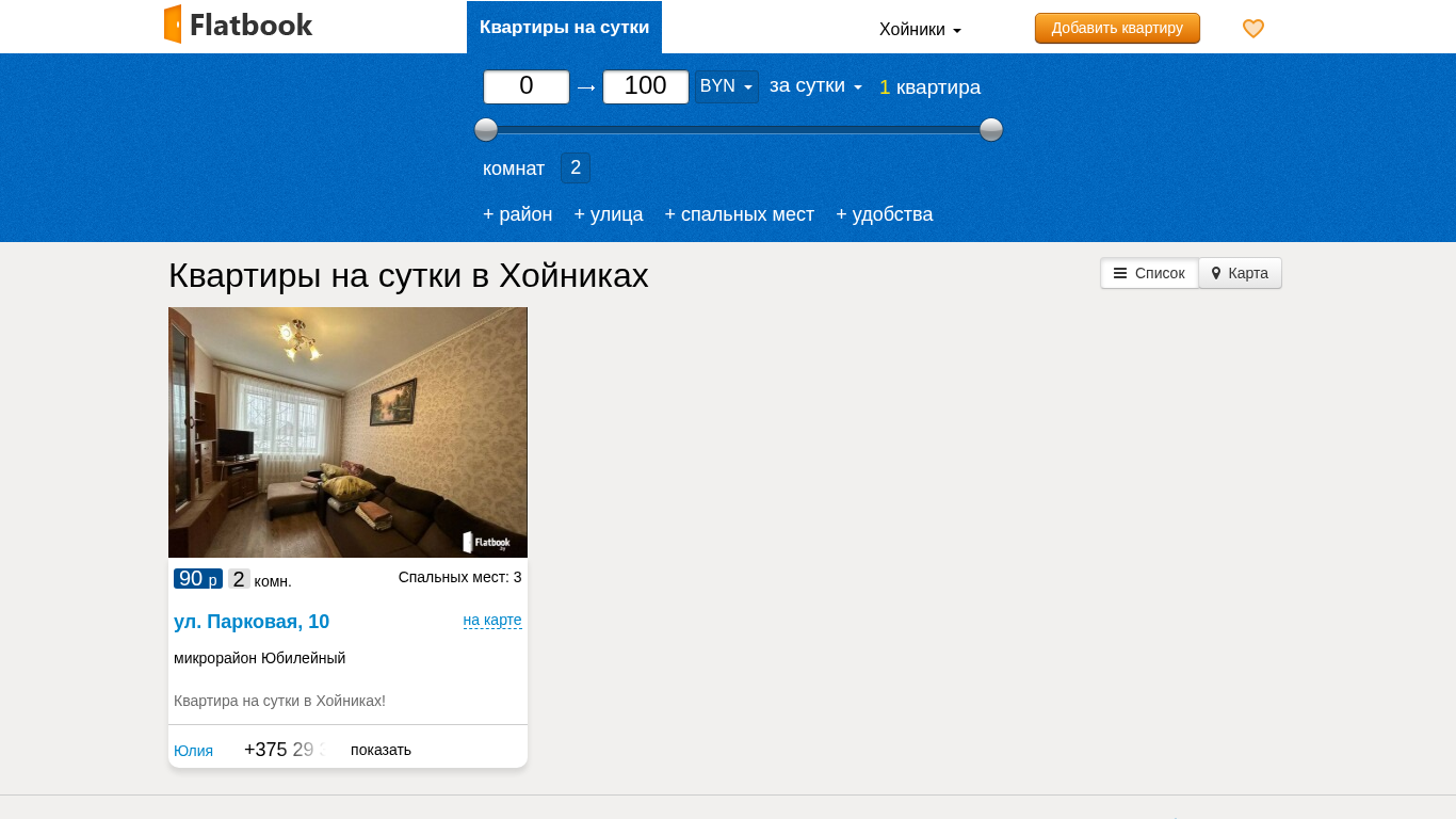 | SEO-описание | Квартиры на сутки в Хойниках: 1 квартир 90-90 р. 1,2,3,4-х комнатные. Сутки/ночь/часы. Любой район. Цены от Хозяев. Выбирайте! |