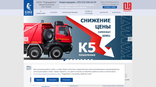 | SEO-описание | Купить грузовой автомобиль КАМАЗ в Минске по лучшей цене у официального дилера. Продажа грузовых автомобилей КАМАЗ в Беларуси. ООО ''ПарадАвто'' - официальный дилер ПАО ''КАМАЗ'' в Беларуси. Характеристики, цены, кредит, лизинг, рассрочка. |