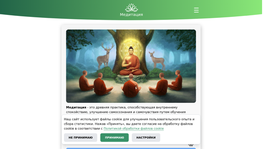 | AI-анализ | The web project "Meditacion.by" is a resource dedicated to meditation practices and related materials. It offers a variety of sections, including music and videos for meditation, techniques, articles, and a collection of mantras with descriptions, audio, and video recordings for different moods. The website requires JavaScript to function properly and includes a user agreement and privacy policy sections, as well as a cookie policy. The site uses cookies to enhance user experience and collect statistics. |