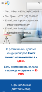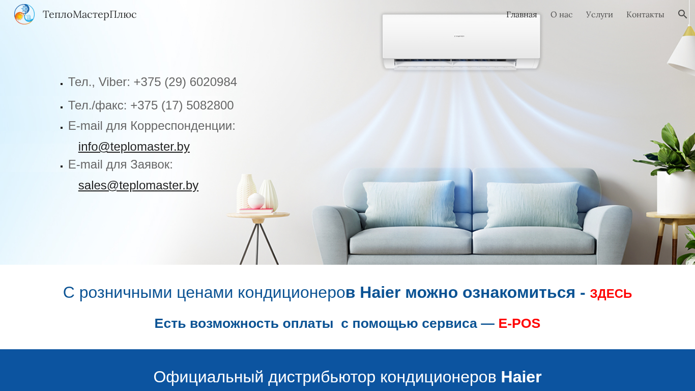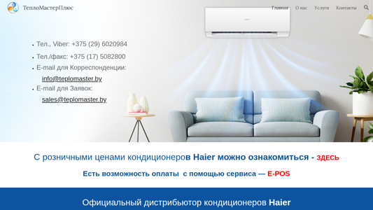 | AI-анализ | This website is called "ТеплоМастерПлюс" (TeplomasterPlus) and is the official distributor of Haier air conditioners in Belarus. The website provides information on the company, its services, and contacts. Users can find contact details such as phone numbers, email addresses, and an address in the Republic of Belarus. The website also offers information on various types of air conditioning systems available for sale, including wall-mounted, semi-industrial, multi-systems, and heat pumps. The company offers sales, installation, and maintenance services for these products, and users can inquire about prices by calling the provided phone numbers. The website is available in Belarusian and Russian languages. |