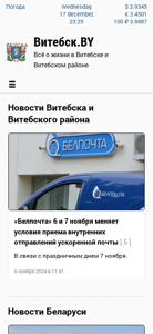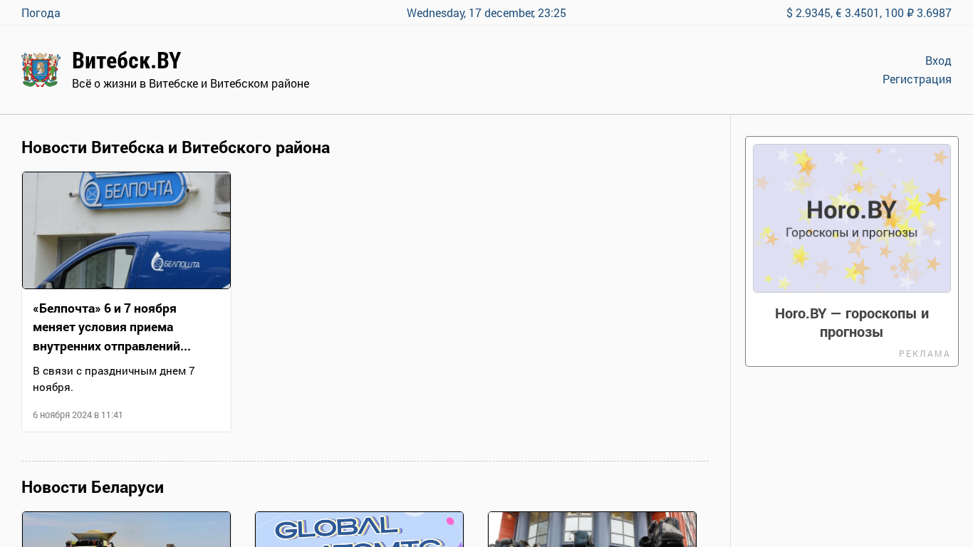 | AI-анализ | The web project Vicebsk.BY is a community-driven platform for residents and visitors of Vitebsk and the Vitebsk region in Belarus. It provides information on local news, events, work opportunities, and leisure activities. The site includes sections for weather updates, registration, and a variety of local news articles. On 6 and 7 November 2024, changes were announced in the conditions for accepting internal mail deliveries in accelerated post for 'Belpochta'. The site also features articles on agriculture in Belarus, which reported a combined grain and rapeseed harvest of 8.7 million tons, as well as a potato yield of over 54,000 tons. On 24 November 2024, RIKZ shared details about the specifics of the Central Test and Central Examination for 2025. President Alexander |
