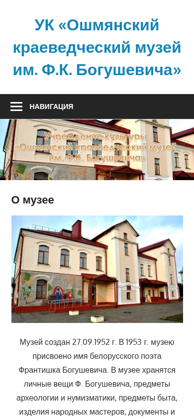 | AI-анализ | This website is for the Oshmyansky District Museum named after F.K. Bogushevich located in Oshmyany, Belarus. The museum was established on September 27, 1952, and was later named after the Belarusian poet Francisk Bohushevich in 1953. The museum holds personal belongings and documents of Bohushevich, as well as archaeological and numismatic items, everyday objects, crafts, and historical documents and photographs from the late 19th to 20th centuries. In 2000, the museum moved to a new building in the city center and was reopened on November 20, 2009. As of January 1, 2025, the museum's collections consist of 25,622 museum items and scientific |