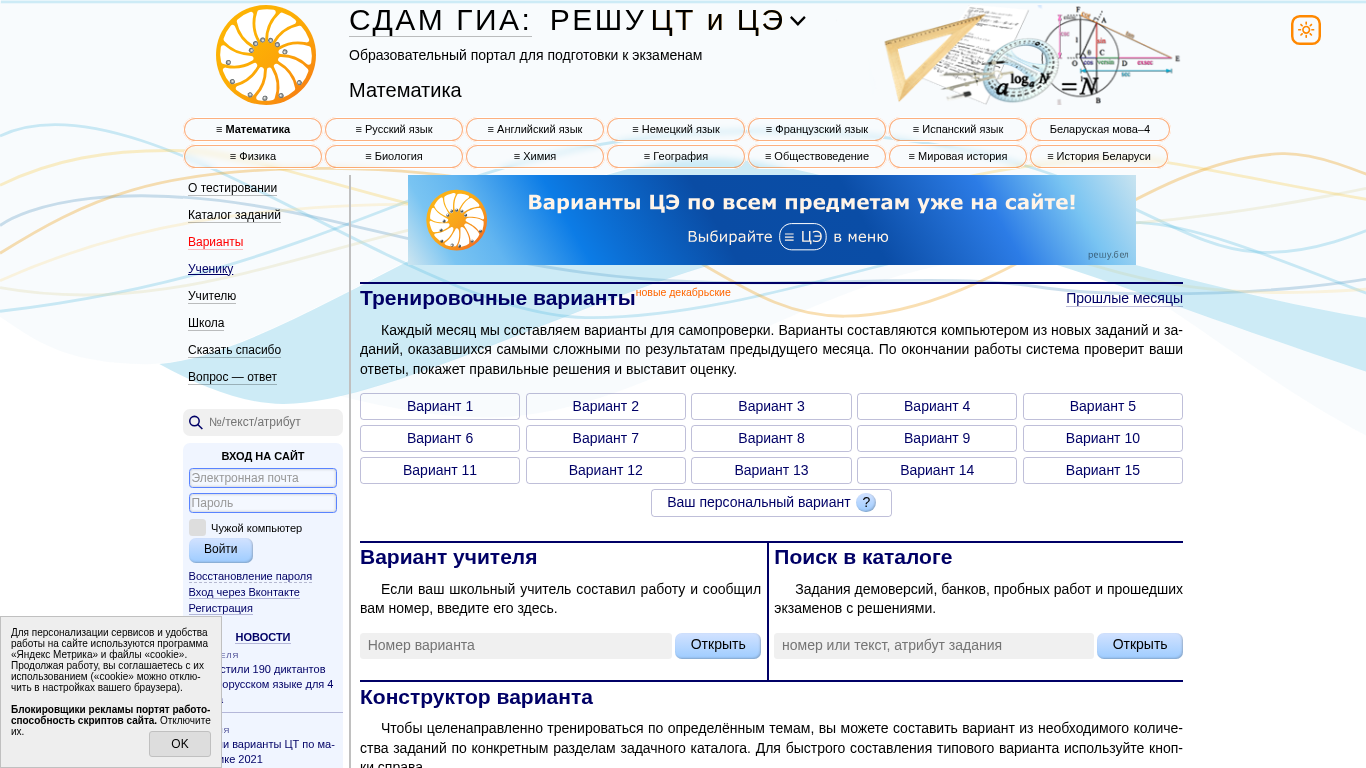 | AI-анализ | This online resource, titled "ЦТ и ЦЭ−2026, Математика: задания, ответы, решения" (Russian for "CT and CE−2026, Mathematics: Tasks, Answers, Solutions"), is a Belarusian educational portal designed to help users prepare for mathematics exams. The site offers access to various mathematics tasks, answers, and solutions for different classes. Users can switch between Russian and English languages. The homepage displays various math categories, including classes 9 and 11, with options to view profiles and bases. The site also includes a menu, news section, and features for login, email access, password recovery, and registration. Additionally, it offers a bot service and mobile applications. The site's main focus is on providing math tasks, answers, and solutions. Users can access previous year's exams |