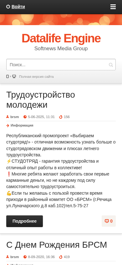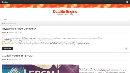 | AI-анализ | The website <brsm.rechitsa.by> is a demonstration page for the DataLife Engine software, titled "БРСМ Речицкий район". Keywords associated with the website include "BRSM", "Речица", "речицкий район". The top words on the website are "brsm", "подробнее", "информация", "года", "молодежь", "речицкого", "семьи", "были", "сайте", "республиканский", "студотряд", "районный", "уже", "знаний", "все", "день", "речицкой", "так", "беларуси". The website contains information about a Republican promotional project called "Выбираем студотряд!" which offers opportunities to |
