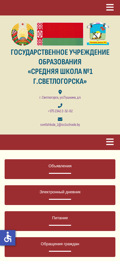 | Адрес | Поиск, Государственное учреждение образования, «Средняя школа №1 г. Светлогорска», г. Светлогорск, ул. Пушкина, д.4 |