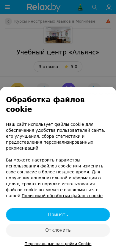 | AI-анализ | The website 'alliance-mogilev.relax.by' is a language school based in Mogilev, Belarus, with the address on Turova Street 5/9. The site provides information on the courses offered, reviews, contact details, working hours, and a map for navigation to the location on relax.by. The top keywords for the site are 'учебный центр альянс могилев' (Mogilev Alliance Educational Center), 'курсы' (courses), 'записаться' (enroll), 'учебный' (educational), 'могилев' (Mogilev), 'турова' (Turova Street), 'детей' (children), 'лет' (years), 'языка' (language), and 'отзыв' (review). The site features three reviews with an average |