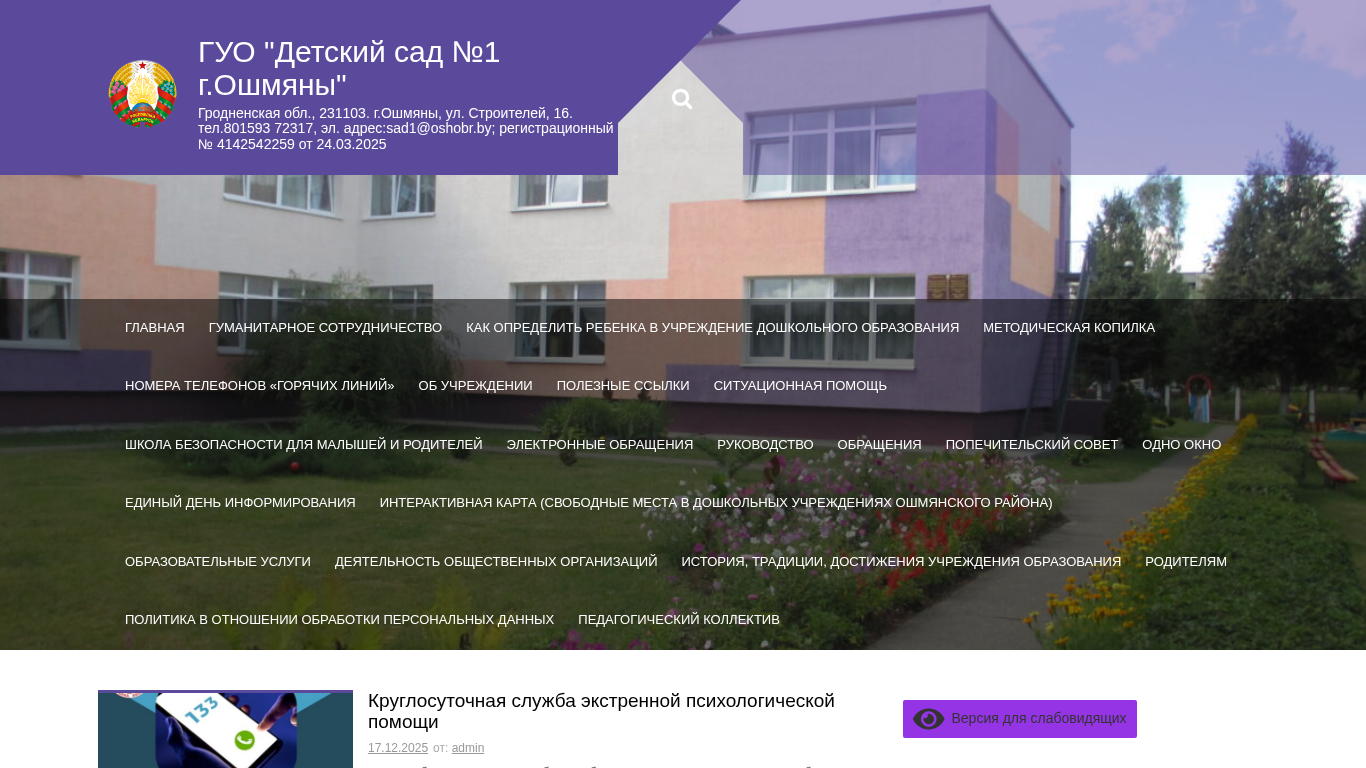 | Название / Заголовок | ГУО "Детский сад №1 г.Ошмяны" — Гродненская обл., 231103. г.Ошмяны, ул. Строителей, 16. тел.801593 72317, эл. адрес:sad1@oshobr.by; регистрационный № 4142542259 от 24.03.2025 |