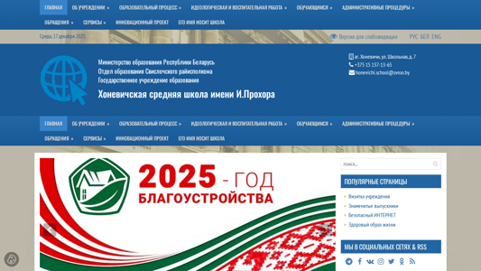 | AI-анализ | This online resource represents the official website of Honetichskaya Middle School named after I. Prokhor (Honetichskaya Srednya Shkola imeni I. Prokhora). The website provides comprehensive information about the school, its structure, management, educational programs, and various initiatives. Keywords associated with the school include 'education', 'institution', 'work', 'activity', 'middle school', and 'Prokhor'. The site includes sections on the school's history, news, contacts, goals, and working hours. Additionally, it offers information on the pedagogical staff, vacancies, canteen, electronic services, and the school's union. The website is rich in multimedia content, including video and photo galleries, and features various projects and initiatives such as 'Memory Tree' and 'Opening Belarus'. The site also offers a library resource with method |